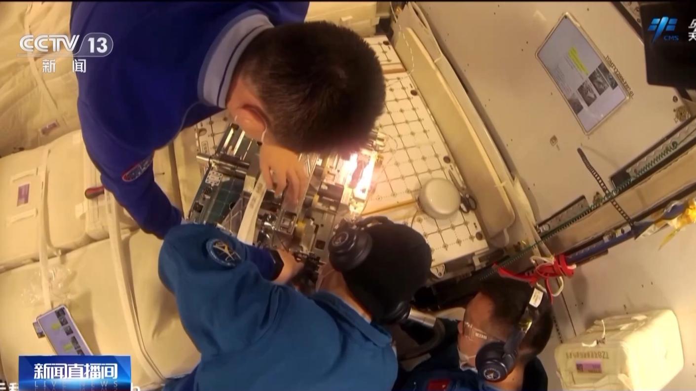微重力物理科学限制多个实际技俩握续进行中,乘组完成了流体物理实际柜及高温材料实际柜实际样品更换、抽真空排废气等多项职责。